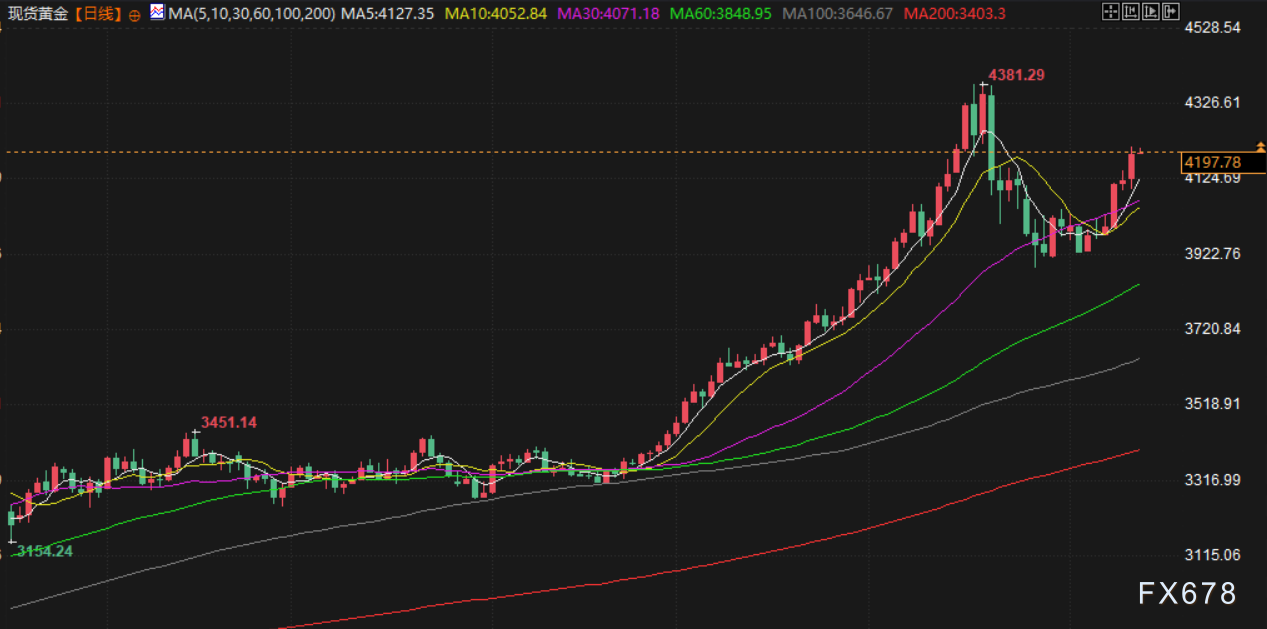 受美债收益率下滑及美联储降息预期增强推动,金价周三强势上涨。现货金价收涨近2%,报每盎司4211.65美元,创10月21日以来新高;美国12月期金收高2.4%,报4213.60美元/盎司。