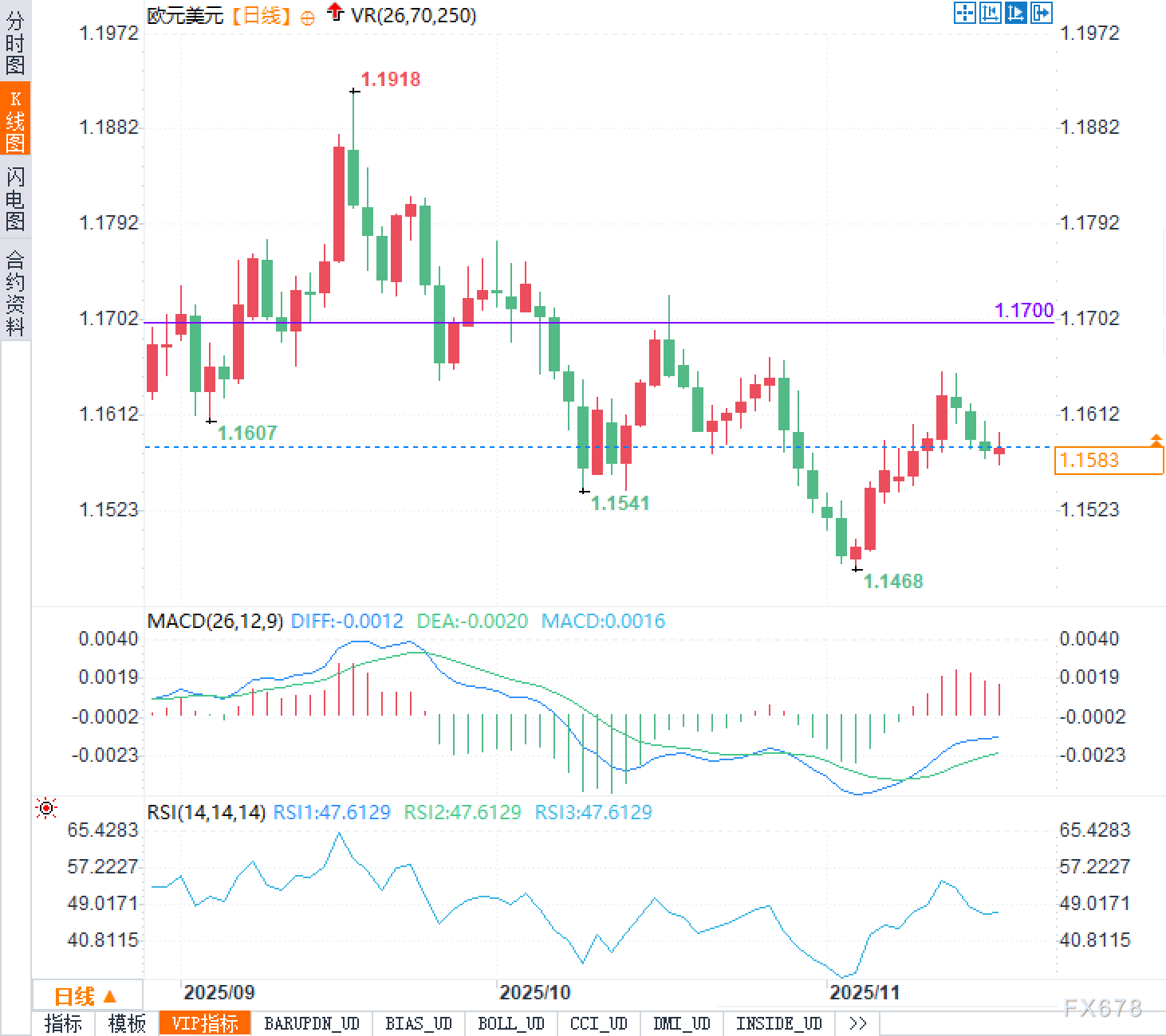 从日线图看,欧元兑美元自1.1918高点一路回落,阶段性低点在1.1468,整体仍处于自上而下的调整结构中。当前汇价在1.1580附近徘徊,略低于前期1.1607一带的密集成交区,短期呈现低位横向整理的特征。上方1.1700一线为前期多次受压位置,构成重要压制;下方关注1.1541及1.1468两个阶段性低点,对价格起到支撑作用。