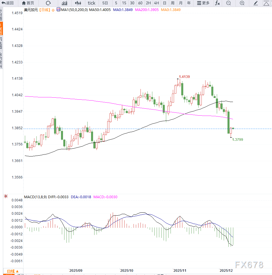 从美元兑加元(USD/CAD)日线结构来看,汇价自1.3800附近的阶段性低位反弹后动能开始放缓,当前在短期均线附近反复震荡,显示多空力量正在重新寻求平衡。